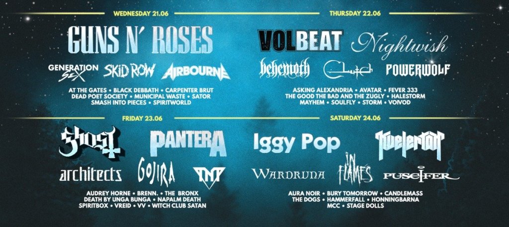 In 2023 on the festival will perform bands such as Pantera, Chost, Guns n’ Roses, Volbeat, Airbourne, Arhitects, Behemoth, Halestorm, Gojira, TNT, Wardruna, At the Gates and many others.
