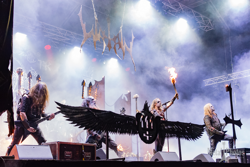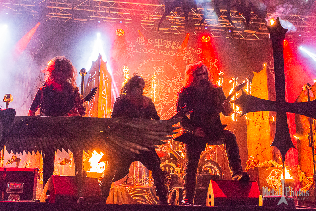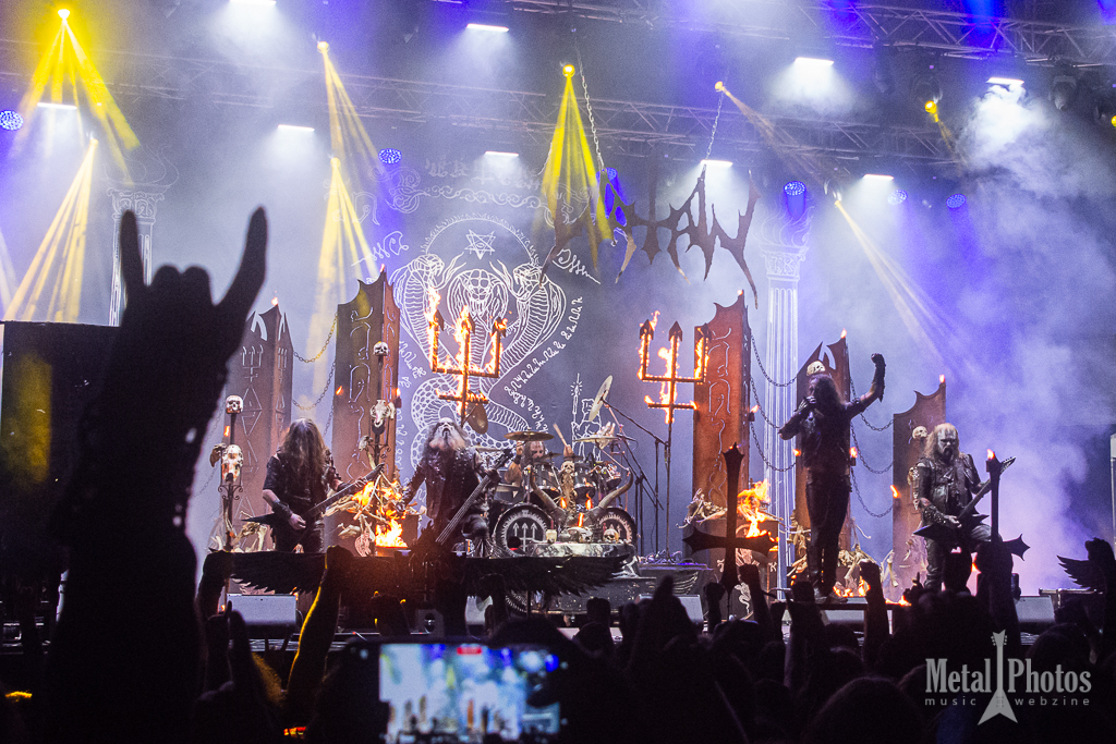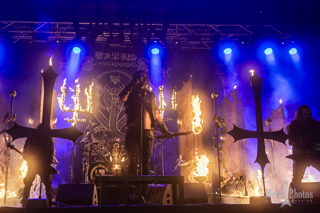 Watain made a show of fire and blood. Almost the entire stage was on fire, the upside-down crosses had little devilish flames on them, black metal eagles were placed on the stage, and other large tridents made of fiery flames rose from the stage and constantly burned above the band’s heads. The singer spilled animal blood in front of the stage, then threw a burning torch at the audience. A girl started waving it towards the stage. The people behind her were singing. It was cold because of the rain.