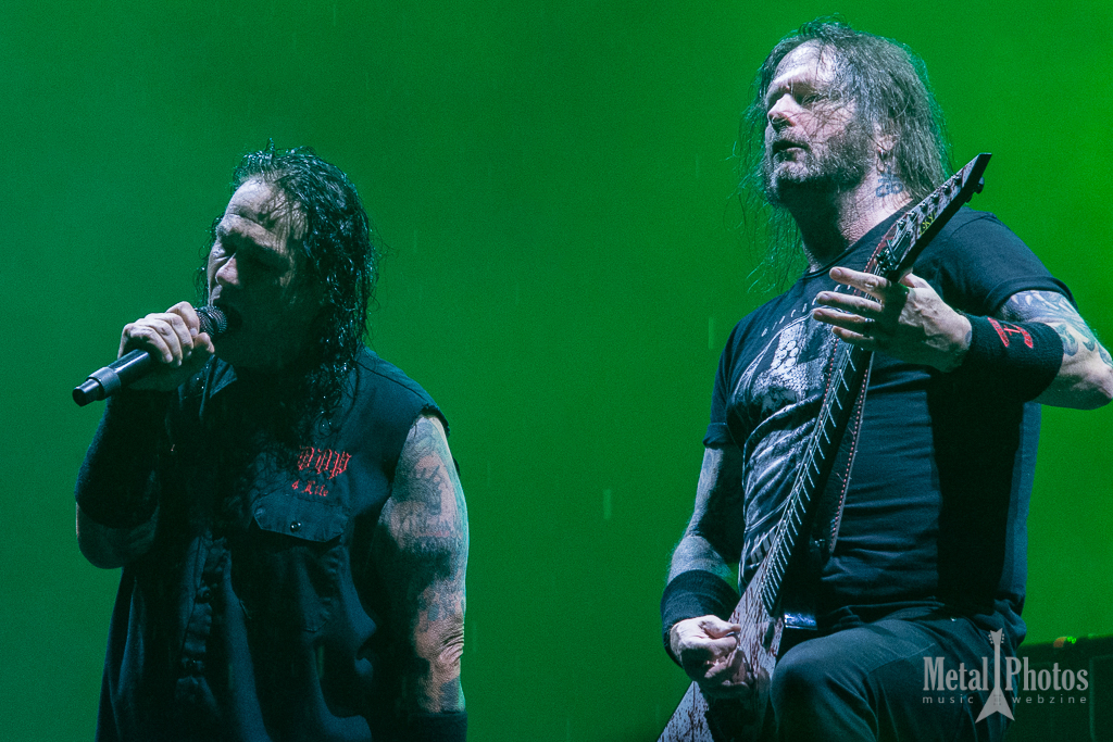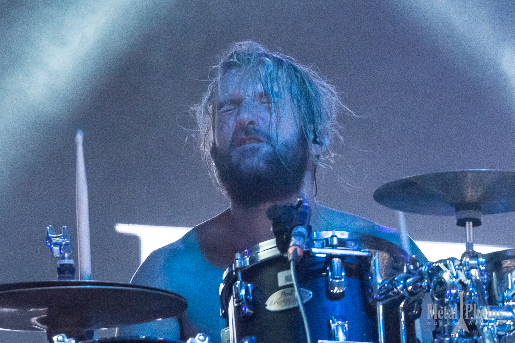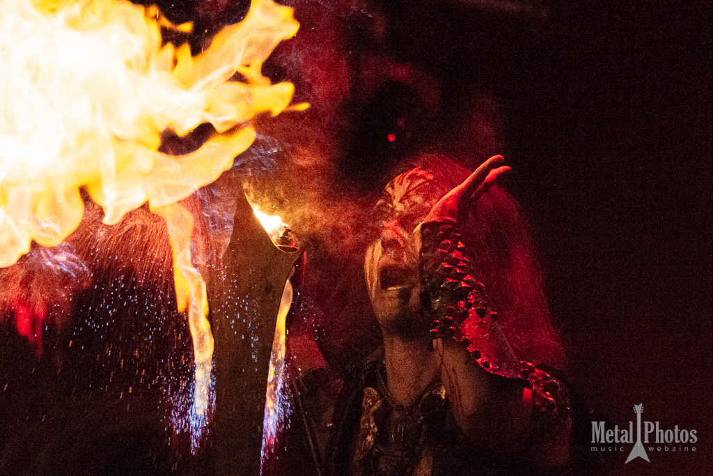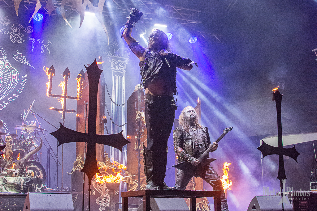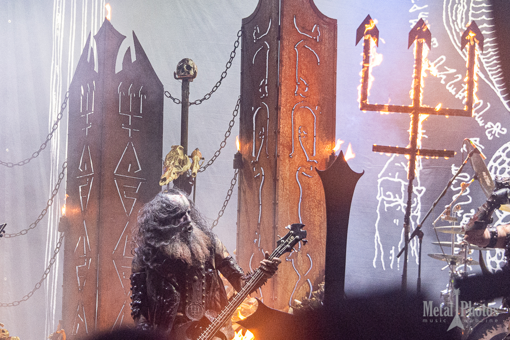 Watain made a show of fire and blood. Almost the entire stage was on fire, the upside-down crosses had little devilish flames on them, black metal eagles were placed on the stage, and other large tridents made of fiery flames rose from the stage and constantly burned above the band’s heads. The singer spilled animal blood in front of the stage, then threw a burning torch at the audience. A girl started waving it towards the stage. The people behind her were singing. It was cold because of the rain.