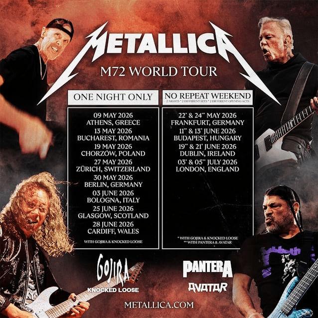 Metallica has had incredible success with their long “M72” World Tour, which started in 2022. With the “No Repeat Weekend” (two concerts in every city, and each one with a totally different set), they captured again the hearts of the people. Now the American monsters of heavy and trash metal have announced new concert dates for 2026. The first concerts will be performed with the French band Gojira and the Americans Knocked Loose. The next part of the concerts will be with the American band Panthera and the Swedish band Avatar. The shows will be performed again on a round stage, with the Snake Pit, a round stage in the center of the stadium, providing a 360-degree view of the show. Most of the concerts will be One Night Only shows, and the two concert nights of No Repeat Weekend will be performed in Frankfurt, Budapest, Dublin, and London.