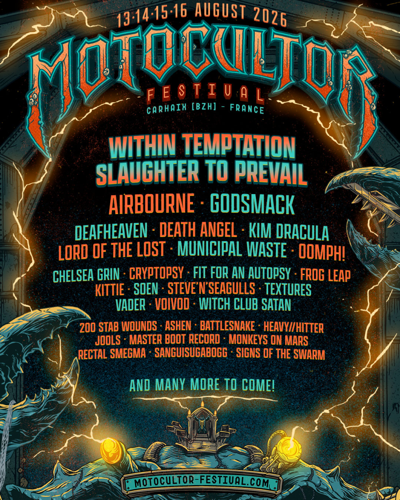 Motocultor Open Air festival has announced the first bands for 2026. The festival will be held on August 13, 14, 15, and 16 in Carhaix, France. The first announced headliners were the Australians Airbourne. Slaughter to Prevail and Godsmack were added later. The newly participating bands are Ashen, Battlesnake, Chelsea Grin, Cryptopsy, Fit For An Autopsy, Heavy//Hitter, Jools, Kim Dracula, Lord Of The Lost, OOMPH!, Rectal Smegma, Sanguisugabogg, Textures, Voivod, and Within Temptation.
