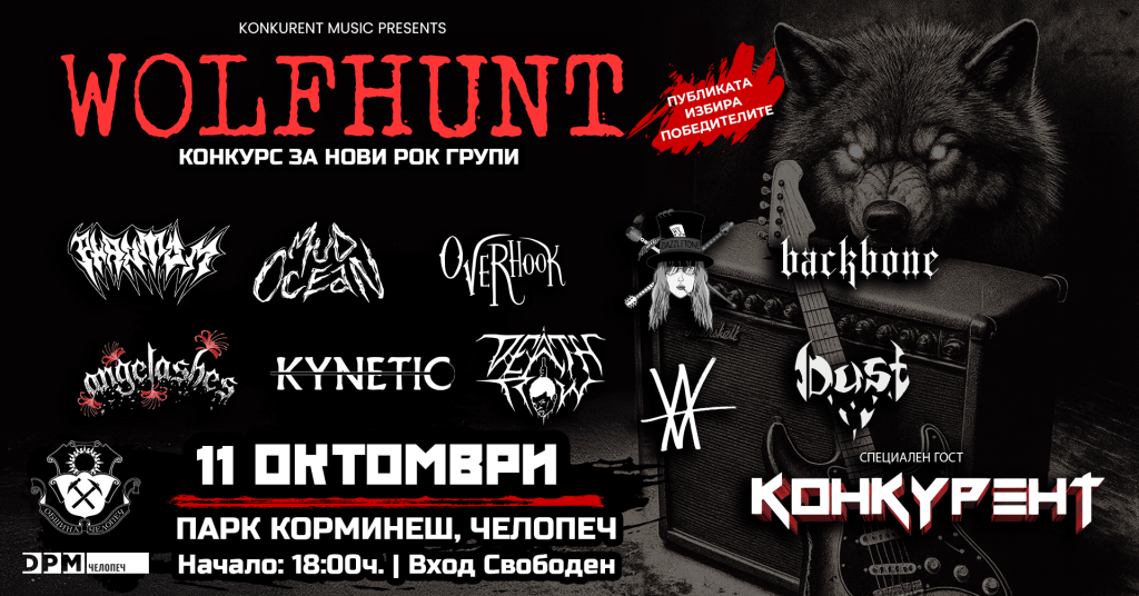 On Saturday, October 11th, 2025, “Korminesh” Park near Chelopech, Bulgaria will become the epicenter of the Bulgarian rock and metal scene. The first WOLF HUNT contest’s edition will gather at one place ten new Bulgarian bands, who will present their author music in an effort to conquer the first place, and the guest artists are the veterans from Konkurent band. The festival is entrance-free and promises to offer not only a musical competition but also a real musical adventure in nature. а истинско музикално приключение сред природата. In this year’s hunt for new talents, ten chosen bands are included: Backbone, Mud Ocean, Phantom, Whatever Men, Overhook, KYNETIC, Angel Ashes, Death Row, Dust and Mr. Dazzletone. Every band will have its time on the stage to ignite the audience with its author’s music. Namely, the audience will be the deciding factor – the fans on site will choose the winner in the contest.