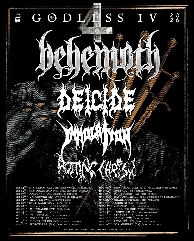 “The Godless IV Tour” 2026 headliners will be supported by Deicide, Rotting Christ, and Immolation. This is the first Behemoth American tour in support of the critically acclaimed “The Shit Ov God” album. The album came out in May 2025 via Nuclear Blast Records. The producer is Jens Bogren of Fascination Street Studios, who worked with Kreator, Enslaved, Rotting Christ, and many others. The album cover is an artwork by Bartek Rogalewicz (BLACK.LODGE.IS.NOW) and Dark Sigil Workshop. Tickets can be found here.