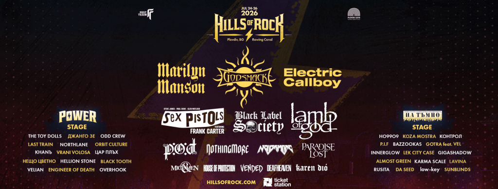 All the participating bands for Hills Of Rock 2026 are: Marilyn Manson, Godsmack, Electric Callboy, Sex Pistols feat. Frank Carter, Black Label Society, Godsmack, P.O.D., Nothing More, Nevermore, Paradise Lost, Of Mice & Men, House of Protection, Vended, Deafheaven, Karen Dió, The Toy Dolls, Last Train, Northlane, Orbit Culture, Odd Crew, Khanъ, Vrani Volosa, Tsar Pluh, Hellion Stone, Black Tooth, Engineer of Death, Overhook, Django Ze, Neshto Cvetno, Velian, H09909, P.I.F., Innerglow, Almost Green, Rusita, Koza Mostra, Bazzookas, Lek City Case, Karma Scale, Da Seed, Kontrol, GOTRA feat. VEL, Gigashadow, Lavina, low-key, Sunblinds. These bands will shake the three festival stages.